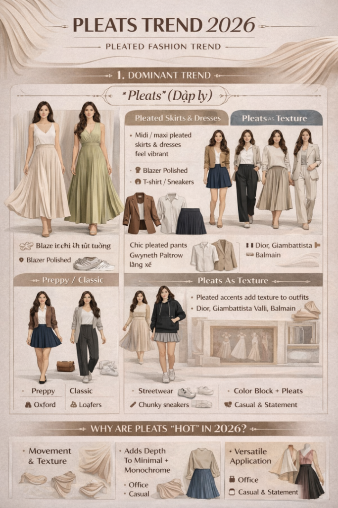 Năm 2026, thời trang công sở không còn cứng nhắc hay đơn điệu. Thay vào đó, các thiết kế dập ly (pleats) trở thành lựa chọn hàng đầu nhờ khả năng tạo phom dáng đẹp, che khuyết điểm và mang lại sự chuyển động mềm mại trong từng bước đi.