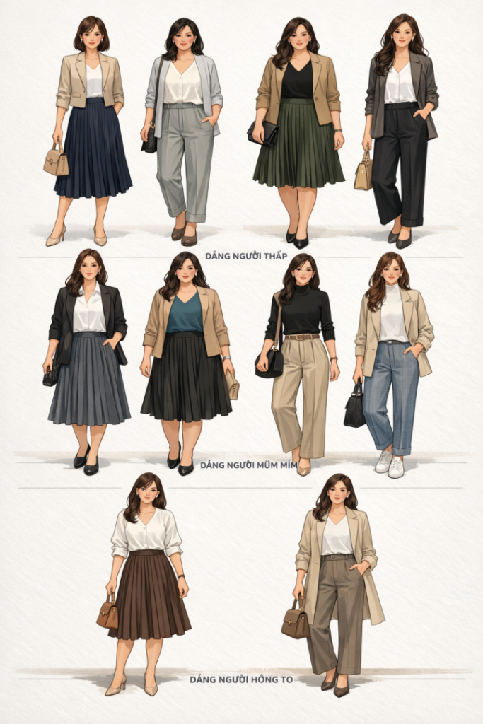 Từ dáng thấp, mũm mĩm đến cao gầy, trang phục dập ly đều dễ điều chỉnh phom để tôn dáng.